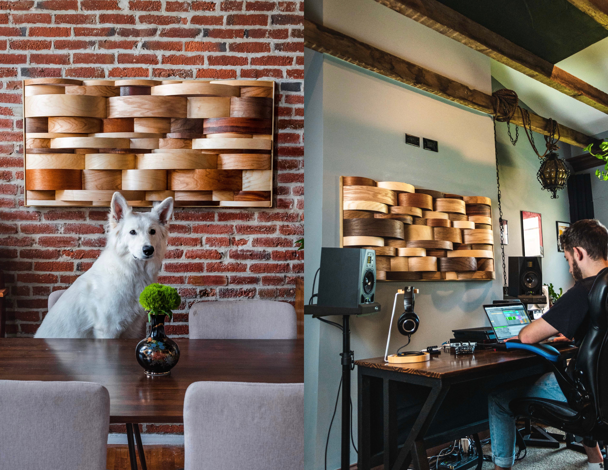 large scale panels incorporate foundations of high frequency acoustic diffusion design, utalizing the curved nature of shells to scatter sound waves. this helps to reduce flutter echo and keep a room feeling “alive” while reducing unwanted sonic artifacts. additional designs incorporating high density acoustic absorption foam are also available.